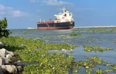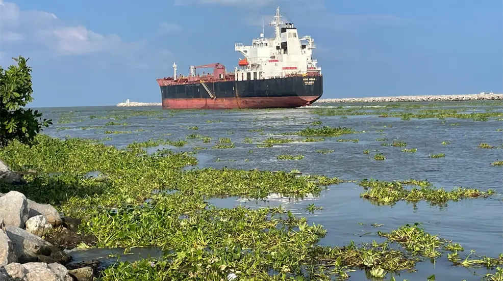 TAMPICO, Tamaulipas.- Inmensas cantidad de lirio acuático llegó a la Playa Miramar a través del Río Pánuco, dando un mal aspecto al máximo paseo turístico de Tamaulipas.