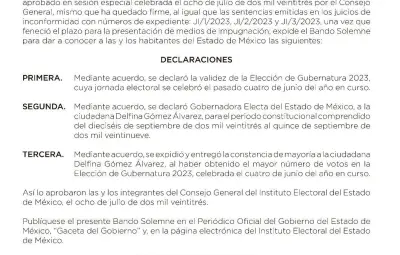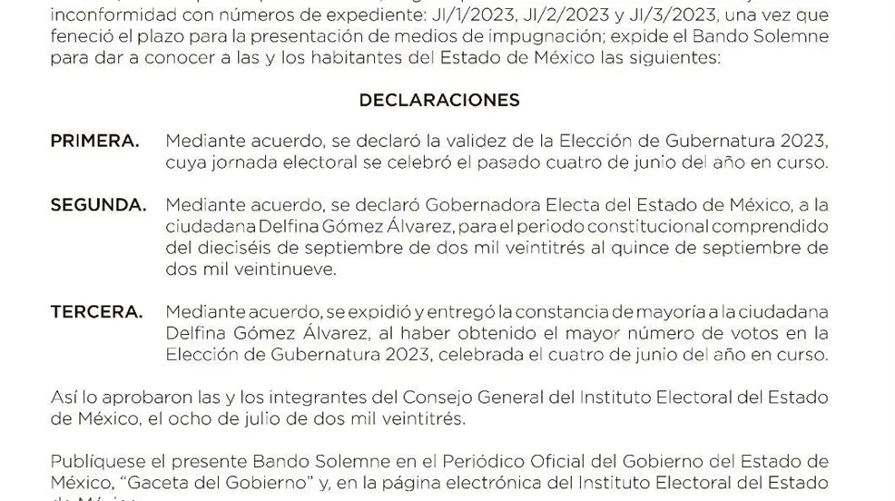 TOLUCA, Estado de México.- El Instituto Electoral del Estado de México (IEEM) expidió el Bando Solemne para dar a conocer a las y los habitantes de la entidad que su Consejo General declara Gobernadora Electa del Estado de México a la maestra Delfina Gómez Álvarez.