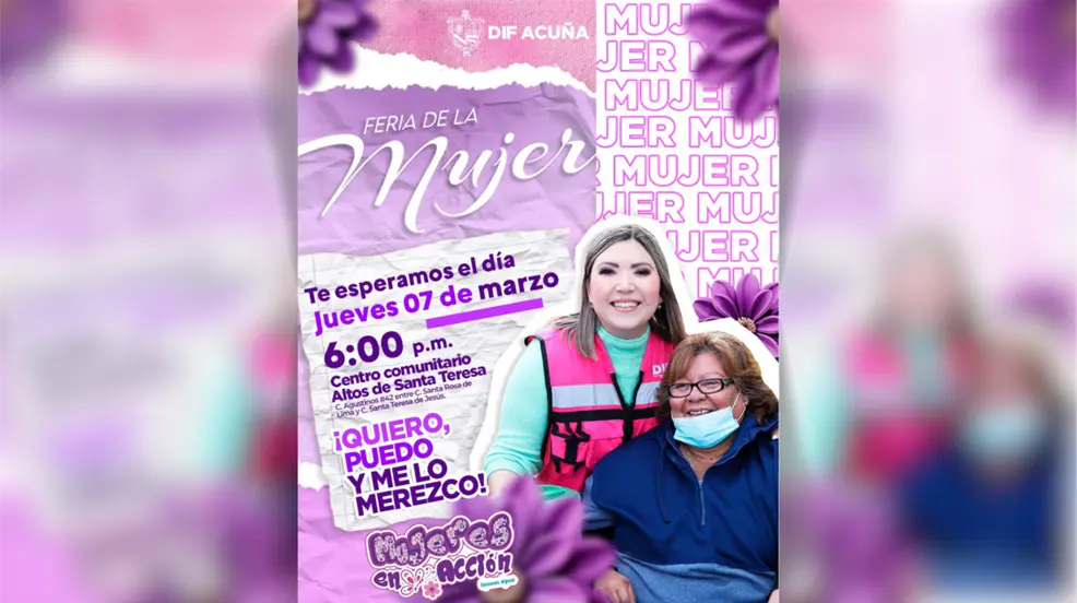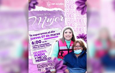 ACUÑA, Coahuila. - El DIF Acuña ha realizado una invitación general para las mujeres, instándolas a participar en la Segunda "Feria de la Mujer", bajo el lema ¡Quiero, Puedo y Me lo Merezco! Mujeres en Acción.