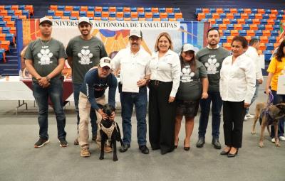 CIUDAD VICTORIA, Tamaulipas.- El rector de la Universidad Autónoma de Tamaulipas (UAT), Dámaso Anaya Alvarado fue testigo de la entrega de diez perros que fueron dados en adopción, a través del evento 'Adopta un Héroe Canino'.
