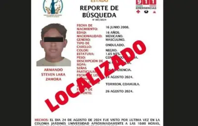 TORREÓN, Coahuila.- Armando Steven Lara Zamora, un joven de 16 años que había sido reportado como desaparecido el pasado 24 de agosto de 2024, ha sido localizado. El menor, quien fue visto por última vez en la colonia Jardines Universidad alrededor de las 10:00 horas, había generado preocupación entre sus familiares y amigos debido a la incertidumbre sobre su paradero.