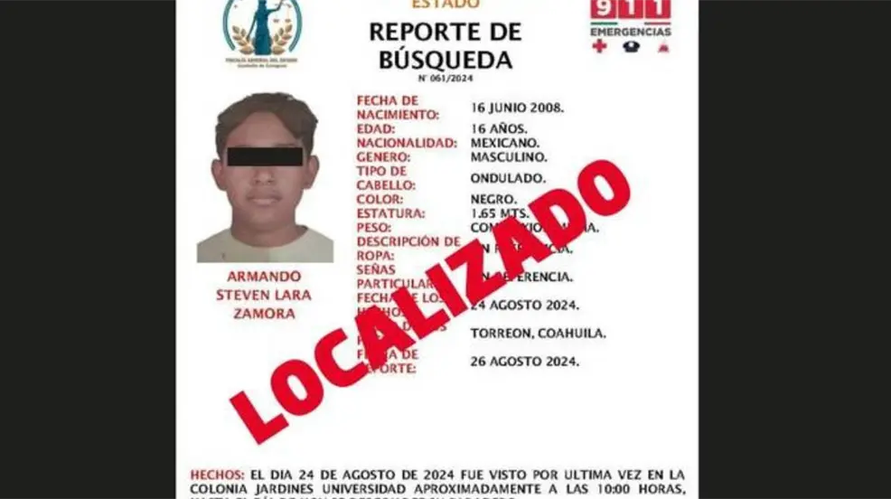 Armando Steven Lara Zamora, de 16 años, reportado como desaparecido el 24 de agosto en Torreón, Coahuila, ha sido localizado con bien.