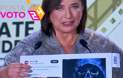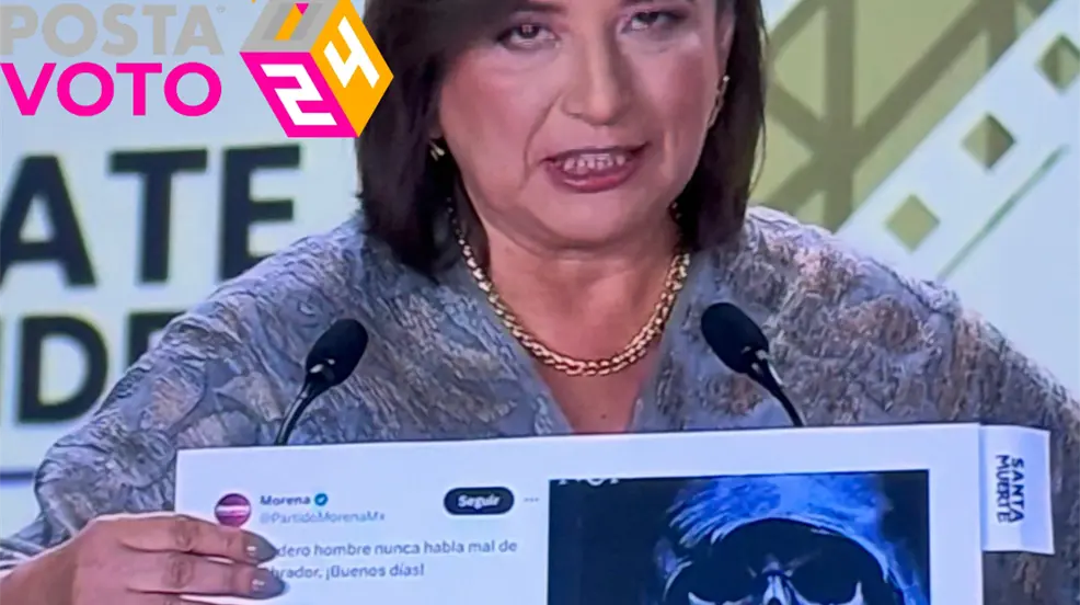 Xóchitl Gálvez no se quedó atrás, pues, antes de terminar la primera sección fue la protagonista al mostrar imágenes de la famosa playera de la Santa Muerte con la leyenda 'Un verdadero hombre no habla mal de AMLO', luego de eso fue regañada por mostrar letreros mientras sus contrincantes hablaban y remato diciendo que le regalaba tiempo a Pardo para responder, lo que no es posible.