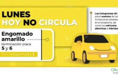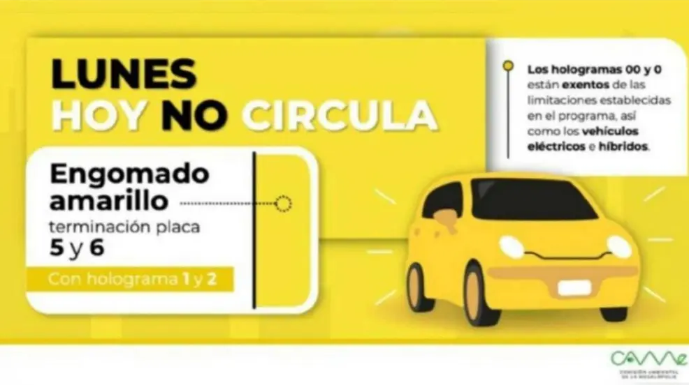 ESTADO DE MÉXICO.- El programa ambiental Hoy No Circula, creado por la Comisión Ambiental de la Megalópolis (CAMe), es un programa semanal que indica los autos que no circulan cada día de la semana, con base a la terminación de la placa y el color del engomado y este lunes 05 de agosto aplica para los autos con holograma 1 y 2, terminaciones de placas 5 y 6 y los que tengan engomado amarillo.