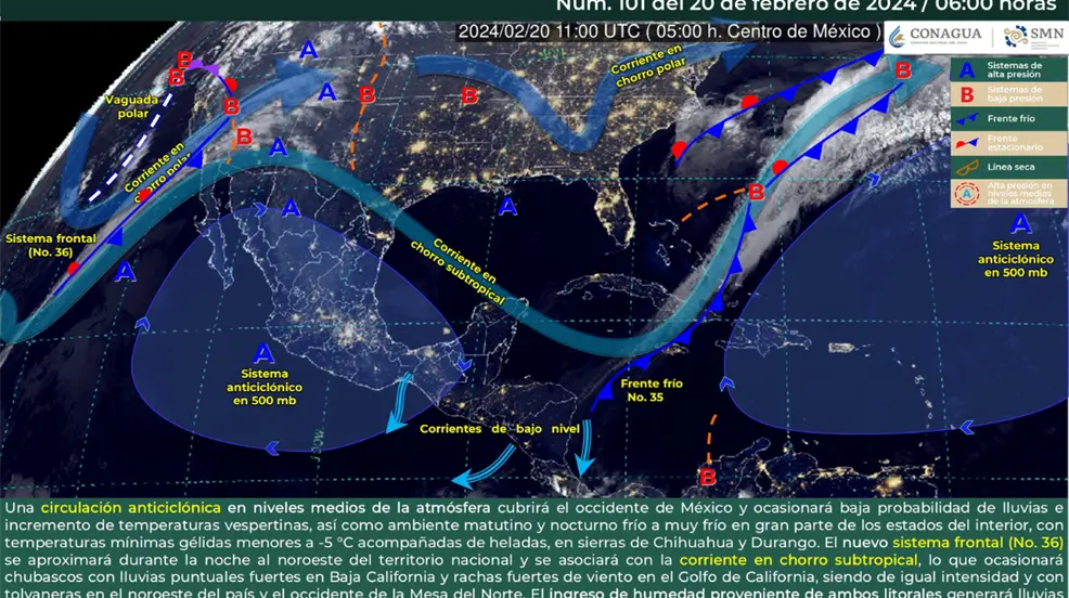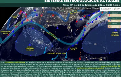 En razón de ello, se han pronosticado temperaturas mínimas gélidas menores a -5°C, acompañadas con heladas, en las sierras de Chihuahua y Durango. Asimismo, el nuevo frente frío no. 36, durante la noche de este lunes 20 de febrero, se aproximará sobre el noroeste de México y, al asociarse con la corriente en chorro subtropical, se generarán lluvias fuertes y rachas fuertes de viento en la Península de Baja California. Esta misma intensidad de rachas de vientos con tolvaneras se vivirán en el noroeste del país y la parte occidental del norte de México.