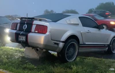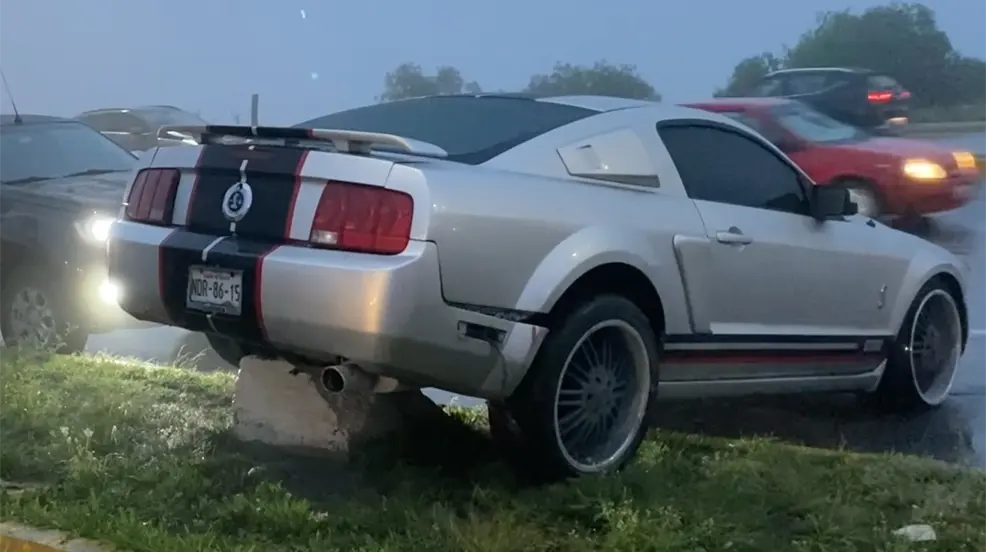 Una mujer perdió el control y quedó arriba de un camellón en su mustang