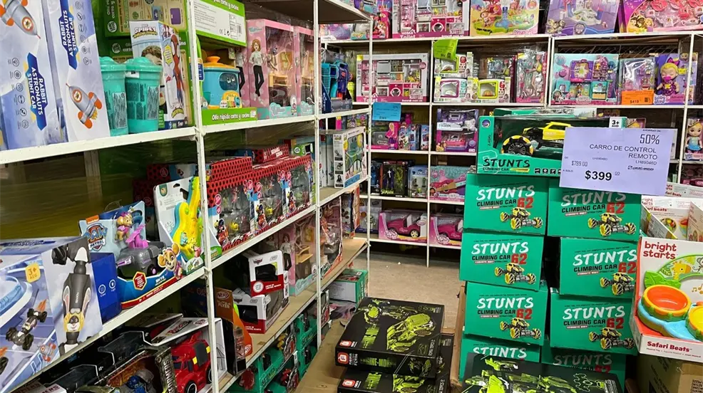 Entre los regalos más buscados están muñecas, pistolas de agua y carros, destacando la variedad de opciones y precios accesibles que ofrece la tienda.