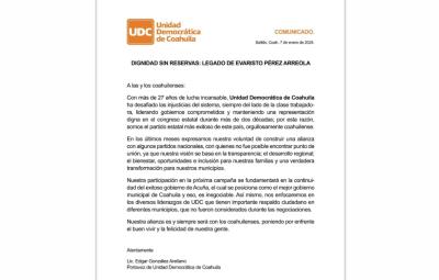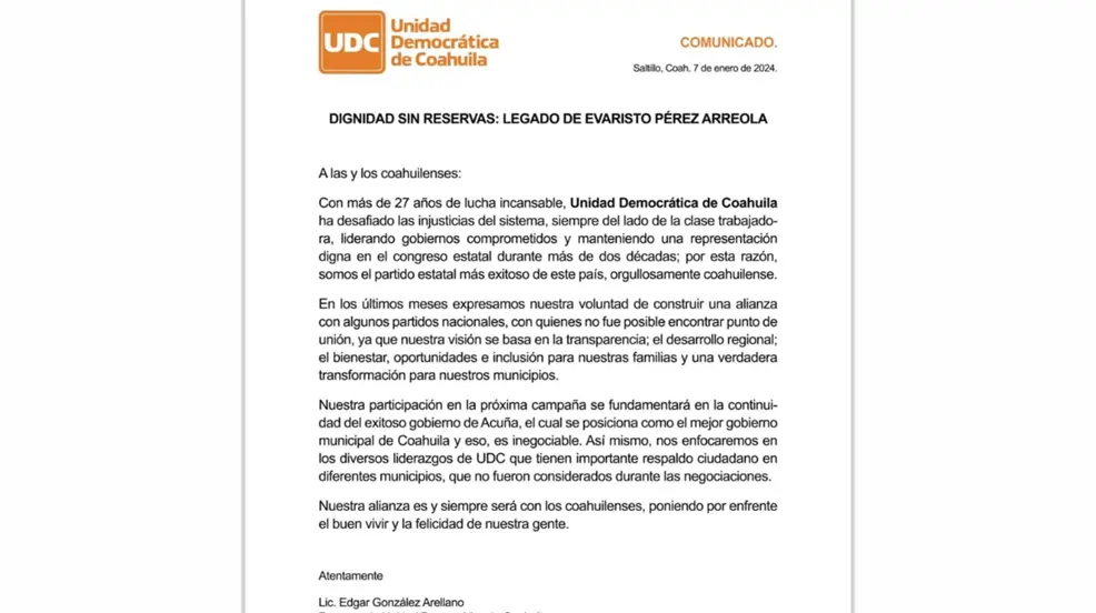 SALTILLO, Coahuila. Con miras al proceso electoral que ya está encaminado en el estado de Coahuila, el partido Unidad Democrática de Coahuila (UDC) informó a través de un comunicado, dirigido a las y los Coahuilenses y simpatizantes de su partido que debido a que no pudieron establecer acuerdos favorables para una 'alianza' con algún partido nacional, para las elecciones de las alcaldías irán como contendientes únicos sin ninguna coalición.
