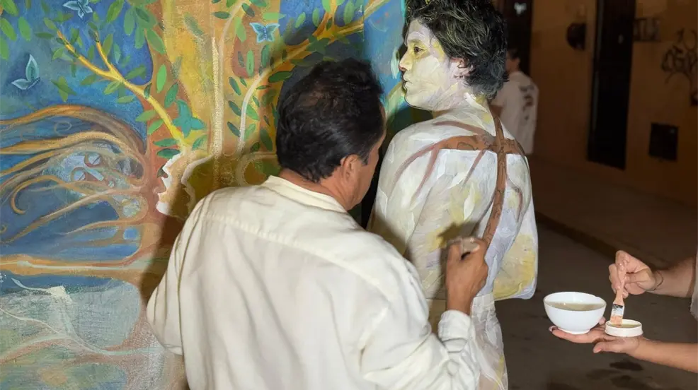 Noche blanca en Mérida: Body paint al aire libre, obra del pintor Abel Vázquez Hernández