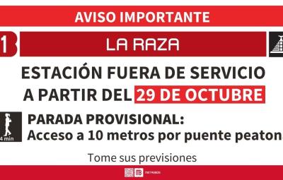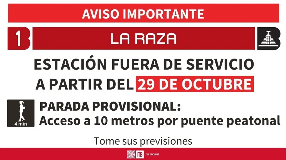 CIUDAD DE MÉXICO.- La secretaría de Movilidad anunció que a partir del domingo 29 de octubre y hasta nuevo aviso, los ascensos y descensos de personas usuarias de la estación "La Raza", de la línea 1, se realizarán de forma temporal en una plataforma contigua, instalada a 10 metros de la actual.