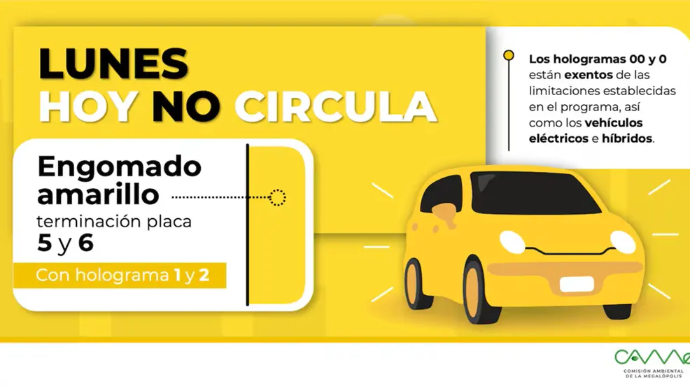 El Programa Hoy No Circula para este lunes 19 de agosto aplica en aquellos autos que tengan engomado color amarillo, así como terminación de placas 5 y 6, y holograma de verificación vehicular 1 y 2, que circulen en CDMX y Edomex.