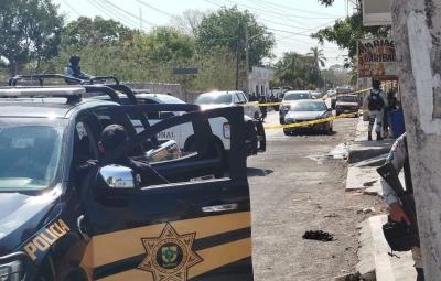 Personal de la policía estatal y de la guardia nacional, custodias las calles con camionetas y armas largas mientras sus compañeros ejecutan el operativo policiaco.