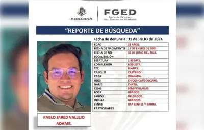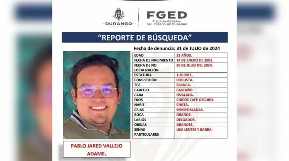 Pablo Jared ya cuenta con reporte de búsqueda emitido por la Fiscalía General del Estado de Durango desde el pasado 31 de julio, y se pide a la población que cualquier información que pueda llevar al paradero de Jared la hagan saber al número de emergencias 911.