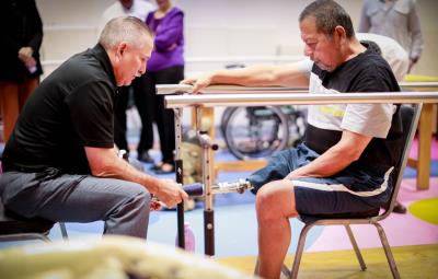 Paciente con prótesis de miembro inferior en terapia física. Foto: DIF Tamaulipas