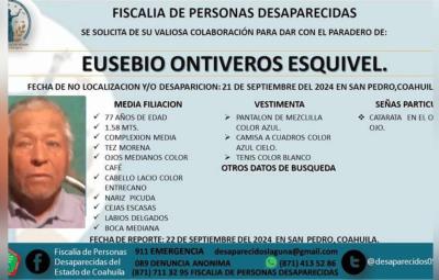 SAN PEDRO, Coahuila.- La Fiscalía de Personas Desaparecidas del estado de Coahuila emitió una ficha de búsqueda para localizar a Eusebio Ontiveros Esquivel, de 77 años, quien fue reportado como desaparecido el pasado 21 de septiembre de 2024 en el municipio de San Pedro, Coahuila.