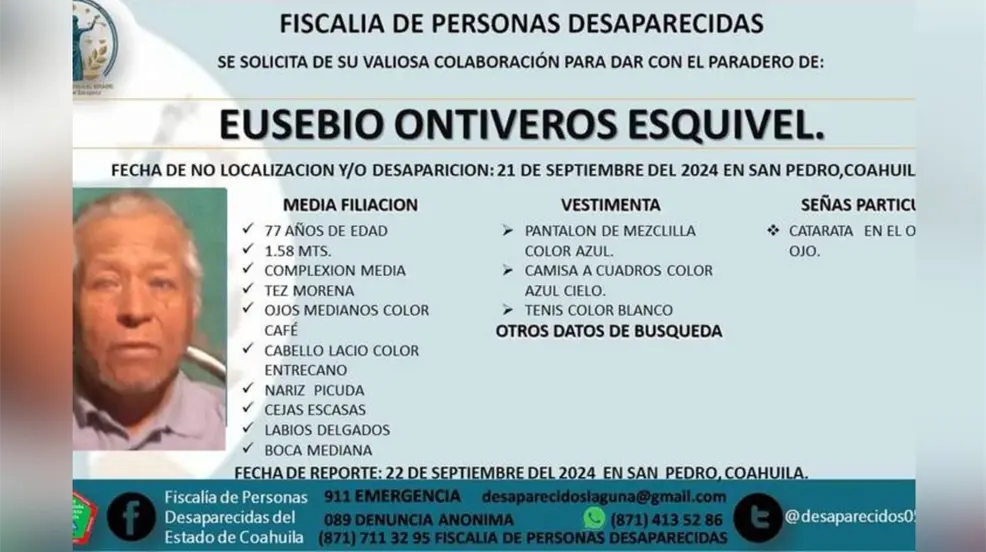 La Fiscalía de Coahuila busca a Eusebio Ontiveros Esquivel, de 77 años, desaparecido el 21 de septiembre en San Pedro. Vestía pantalón de mezclilla y camisa azul; tiene catarata en el ojo derecho.
