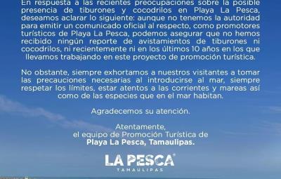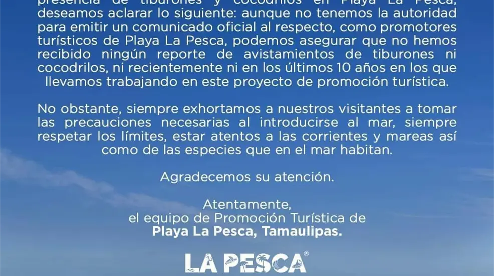 CIUDAD VICTORIA, Tamaulipas.- El equipo de Promoción turística de Playa La Pesca, Tamaulipas, emitió un comunicado para asegurar a los turistas que no hay ningún riesgo respecto a la presencia de cocodrilos o tiburones.