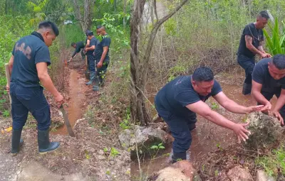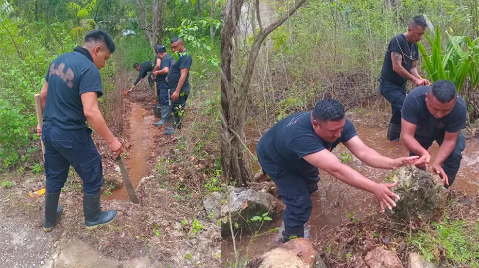 Los uniformados retiraron piedras y maleza para abrirle paso al agua. Acciones como esta se han repetido en otras comunidades, como ejemplo, Tiholop, en el municipio de Yaxcabá, donde también ayudaron a drenar el agua que alcanza el medio metro de altura en algunas viviendas.