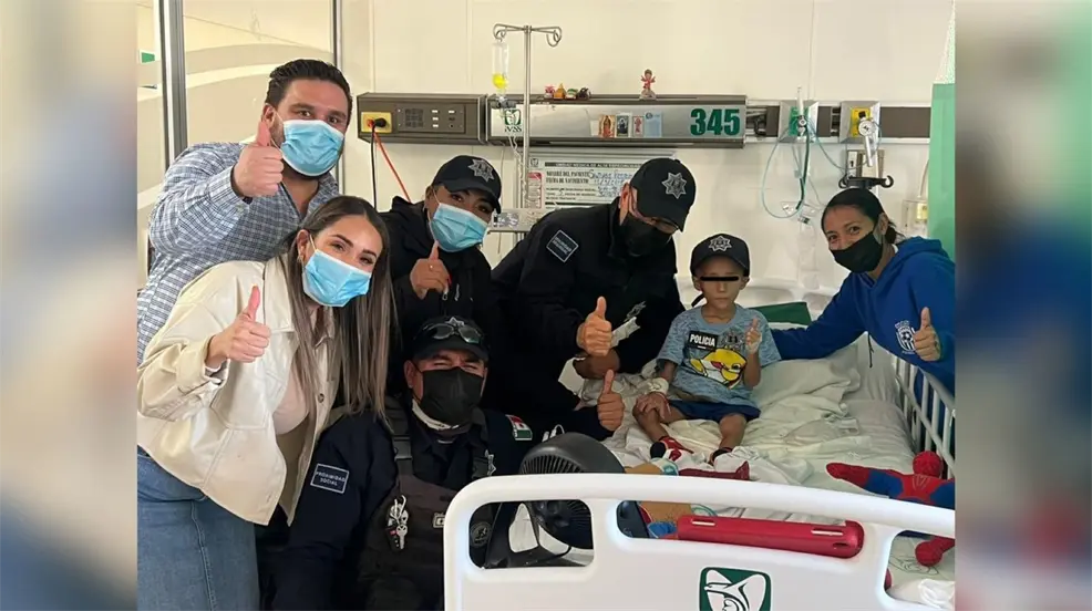 Elementos de la Policía Municipal de Gómez palacio visitaron a Santiago, un niño que está internado recibiendo quimioterapias y que sueña ser como ellos, llevándole obsequios como una gorra.