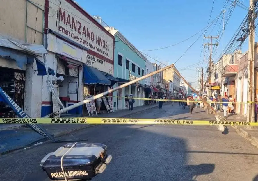 Poste de alumbrado público, se cae en medio de la calle del centro de Mérida
