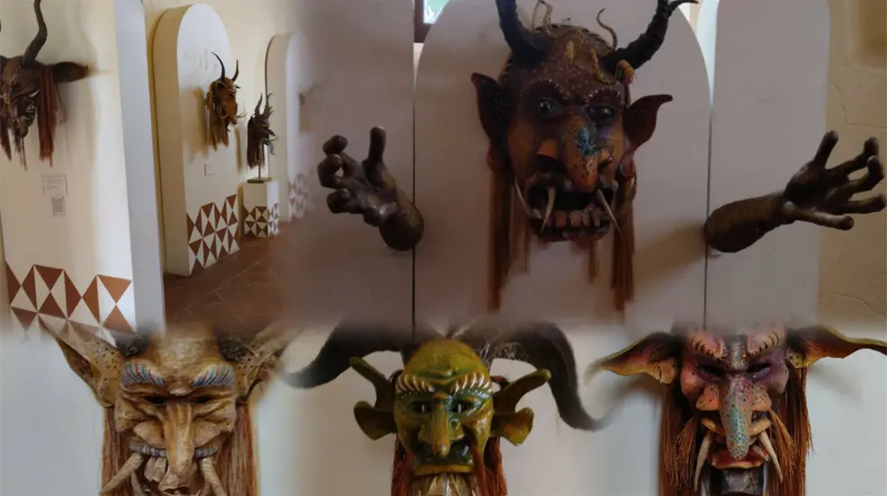 Las máscaras representan tanto seres antropomorfos como zoomorfos, con rasgos característicos como cuernos, colmillos, dientes grotescos y orejas que aluden a animales o seres míticos.