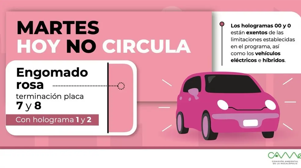 CIUDAD DE MÉXICO.- Este martes 23 de abril, como parte del programa Hoy No Circula, se establece la restricción para la circulación de vehículos con engomado de color rosa, holograma 1 o 2, y cuyas placas terminen en los números 7 y 8.