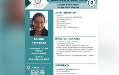 SALTILLO, Coahuila.- Laisha Fernanda González Braian, una joven de 26 años originaria de Ciudad Acuña, Coahuila, es el centro de una intensa búsqueda desde el 17 de octubre de 2024, cuando salió del centro de rehabilitación Cristo Vive, en Saltillo, sin que hasta el momento se tenga conocimiento de su paradero.