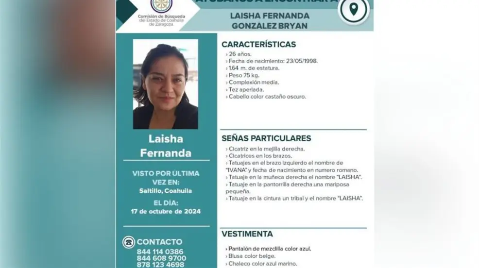 La Comisión de Búsqueda del estado de Coahuila emitió una alerta para dar con el paradero de Laisha. Se describe a la joven como de complexión media, 1.64 metros de altura, cabello castaño oscuro y con tatuajes que podrían facilitar su identificación: un nombre "Ivana" en el brazo izquierdo, el nombre "Laisha" en la muñeca derecha y en la cintura, así como una mariposa en la pantorrilla derecha. La última vez que fue vista llevaba un pantalón de mezclilla azul, una blusa beige, un chaleco azul oscuro y tenis negros con blanco.