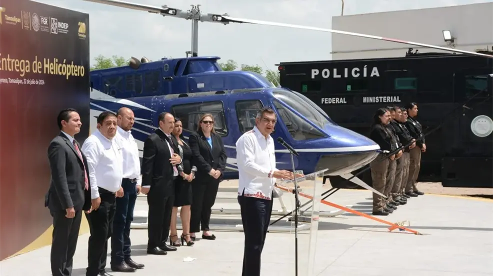 Como parte de sus actividades, el gobernador asistió este mediodía a las instalaciones de la Fiscalía General de la República, en donde acompañado por la cónsul general de Estados Unidos en Matamoros, Brianna Powers y de Ernesto Cuitláhuac Vázquez Reyna, titular de la FGR en Tamaulipas, y funcionarios del INDEP ( Instituto Nacional para Devolver al Pueblo lo Robado), recibió la donación al Gobierno de Tamaulipas de un helicóptero Bell 206 que fue decomisado por esta institución.
