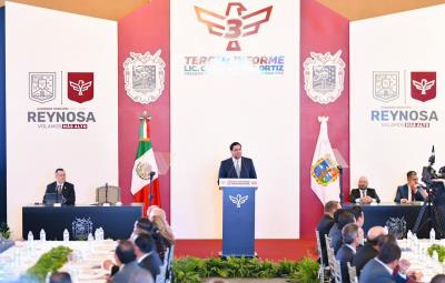 El Alcalde también subrayó la creación de 36 mil 700 empleos en tres años, la inversión de más de 1,000 millones de dólares en capital extranjero, y el apoyo a 17,000 estudiantes a través de la Feria de Regreso a Clases. Destacó que Reynosa se ha convertido en una ciudad educadora, con más de 500 millones de pesos destinados a becas, logrando que el egreso de estudiantes aumentara del 53% al 94%.