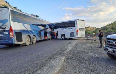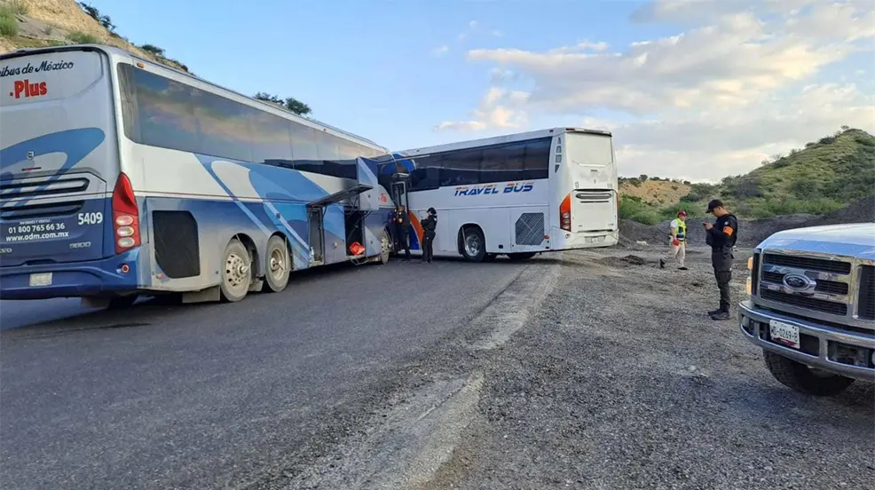 JAUMAVE, Tamaulipas.- Un choque entre un autobús de turismo y un ómnibus de la línea Ómnibus de México dejó como saldo una mujer lesionada, varios pasajeros con crisis nerviosa y cuantiosos daños materiales. El accidente se registró alrededor de las 6:30 de la mañana en el kilómetro 35 de la carretera Rumbo Nuevo, generando un caos vial que duró varias horas.