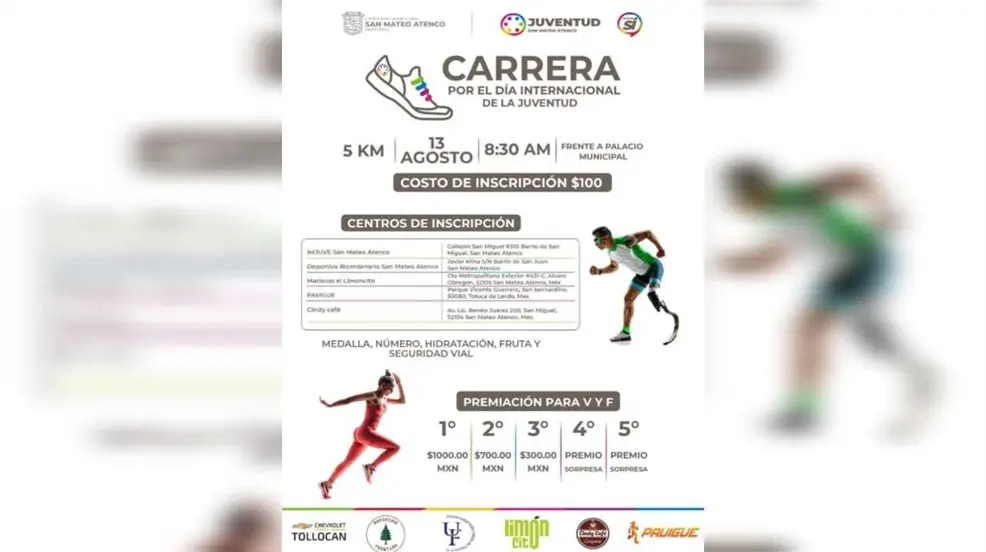 SAN MATEO ATENCO, Estado de México.- San Mateo Atenco se alista con una emocionante carrera atlética que se llevará a cabo el próximo domingo 8 de septiembre. El evento, organizado por el gobierno municipal bajo la dirección de Ana Muñiz Neyra y el Instituto Municipal de la Juventud, busca promover la actividad física y el deporte entre todos los habitantes del municipio.