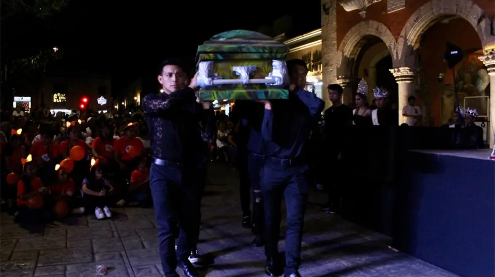 El entierro de Juan Carnaval se lleva a cabo en los bajos del Palacio Municipal de Mérida, en donde se despide y recuerda su legado con mucho humor, como en esta ocasión con la presencia del show de Cuxum y compañía.