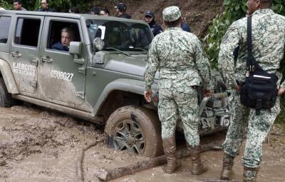 El presidente Andrés Manuel López Obrador, se trasladó a zona afectada de Acapulco tras el paso del huracán Otis, pero el vehículo militar quedó atascado en el lodo, por lo que llegó caminando.