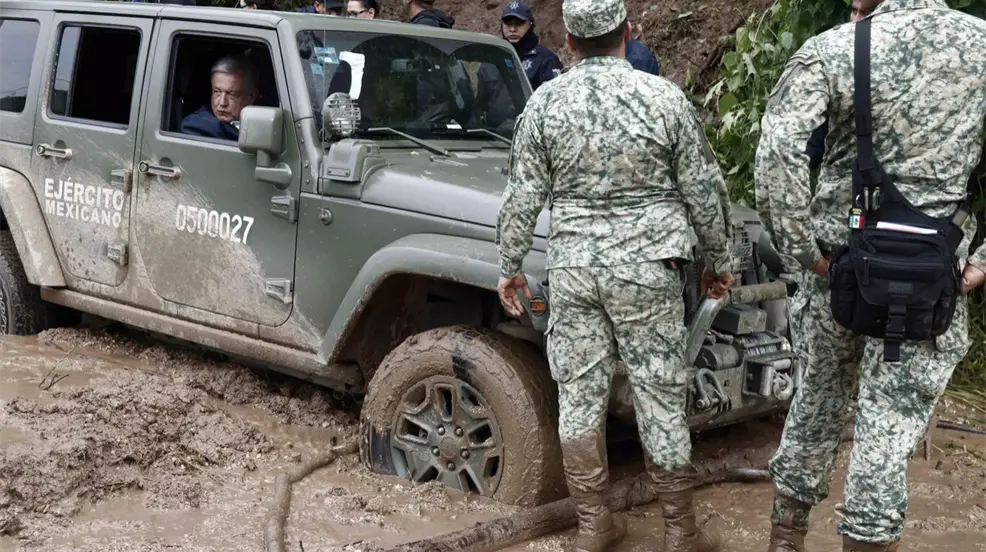 Se atasca camioneta donde viajaba AMLO, llega camionando a Acapulco tras Otis