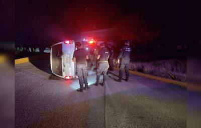 POANAS, Durango.- Al distraerse con el estéreo de su coche, un automovilista sufrió un aparatoso accidente carretero, en el que su camioneta acabó volcada.