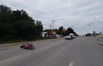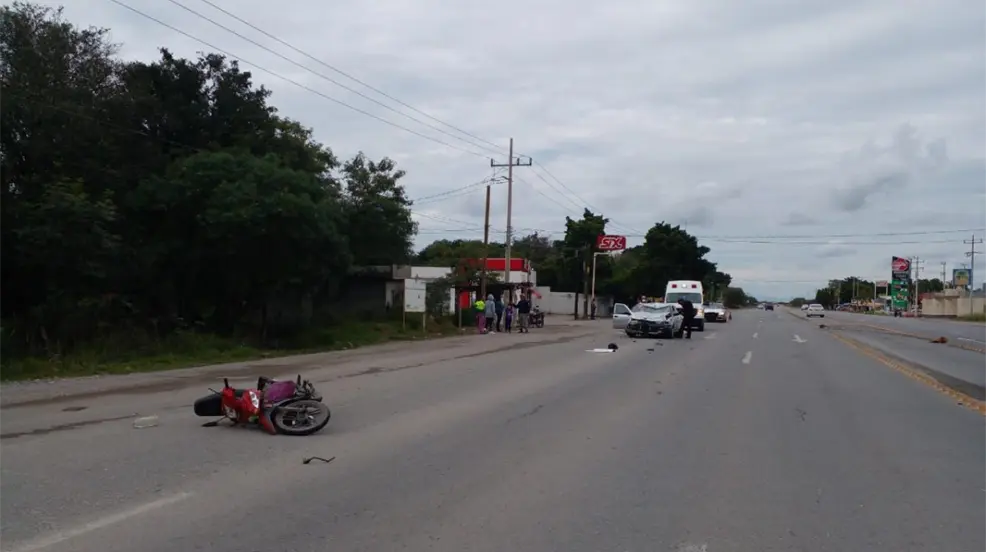El percance ocurrió frente al ejido Laborcitas, cuando el conductor de una motocicleta de la marca Italika que circulaba por la carretera, intentó entrar al ejido sin percatarse de un carro Tsuru que venía de frente.