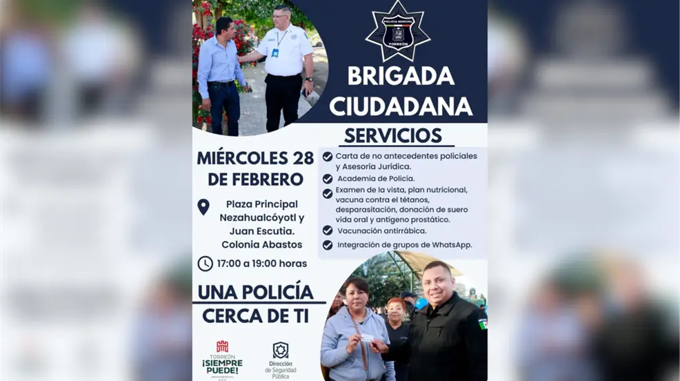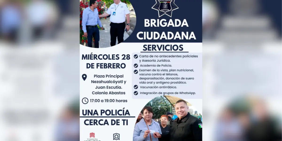 TORREÓN, Coahuila. - La Dirección de Seguridad Pública del Municipio de Torreón ha extendido una invitación general a los residentes de la colonia Abastos para participar en la segunda Brigada Ciudadana, programada para el miércoles 28 de febrero. Esta iniciativa busca acercar diversos servicios a la comunidad, promoviendo el bienestar y la seguridad de los habitantes.