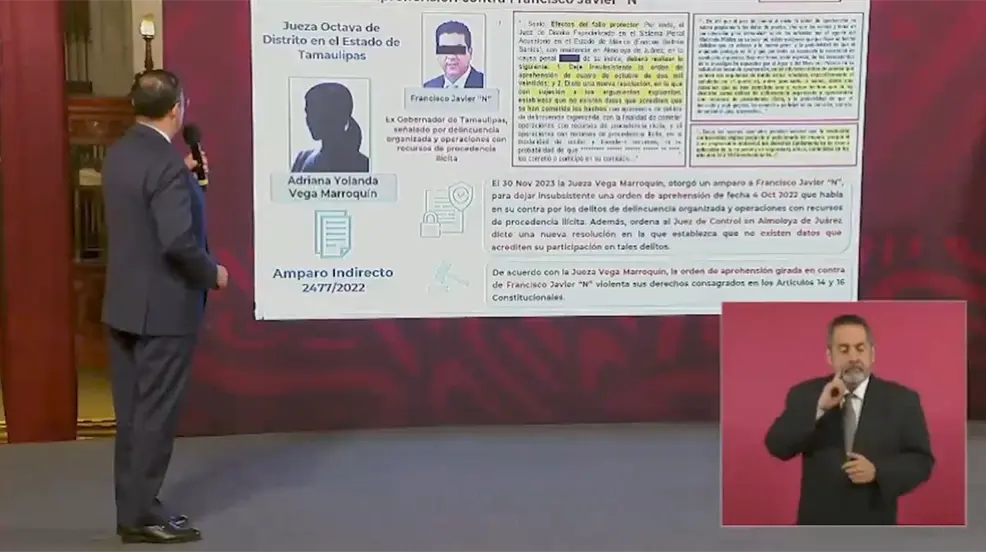 VICTORIA, Tamaulipas.- Las críticas a jueces e integrantes del Poder Judicial continúan en la "mañanera", desde donde hoy se señaló a la jueza octava del Estado de Tamaulipas, Adriana Yolanda Vega Marroquín, por supuestamente beneficiar con una de sus resoluciones al ex gobernador tamaulipeco, Francisco García Cabeza de Vaca.