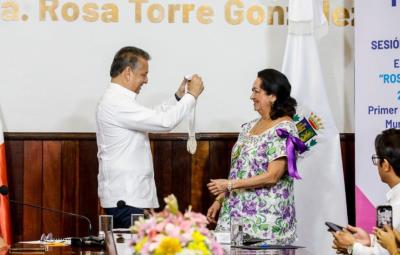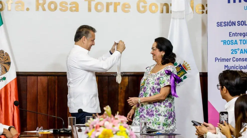 MÉRIDA, Yucatán.- Para reconocer a las mujeres que han marcado la historia de la ciudad, en sesión solemne de Cabildo, el Presidente Municipal Alejandro Ruz entregó la Medalla “Rosa Torre González” a Silvia América López Escoffié.