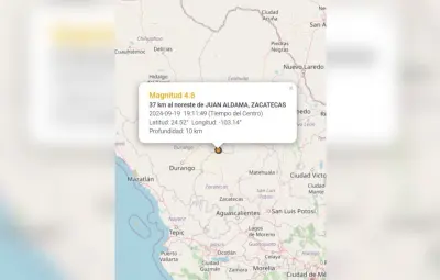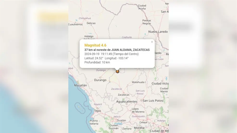 DURANGO, Durango.- El Servicio Sismológico Nacional reportó un sismo de magnitud 4.6, a 37 kilometros al noreste del municipio Juan Aldama en Zacatecas mismo que fue perceptible en algunas localidades de Durango.