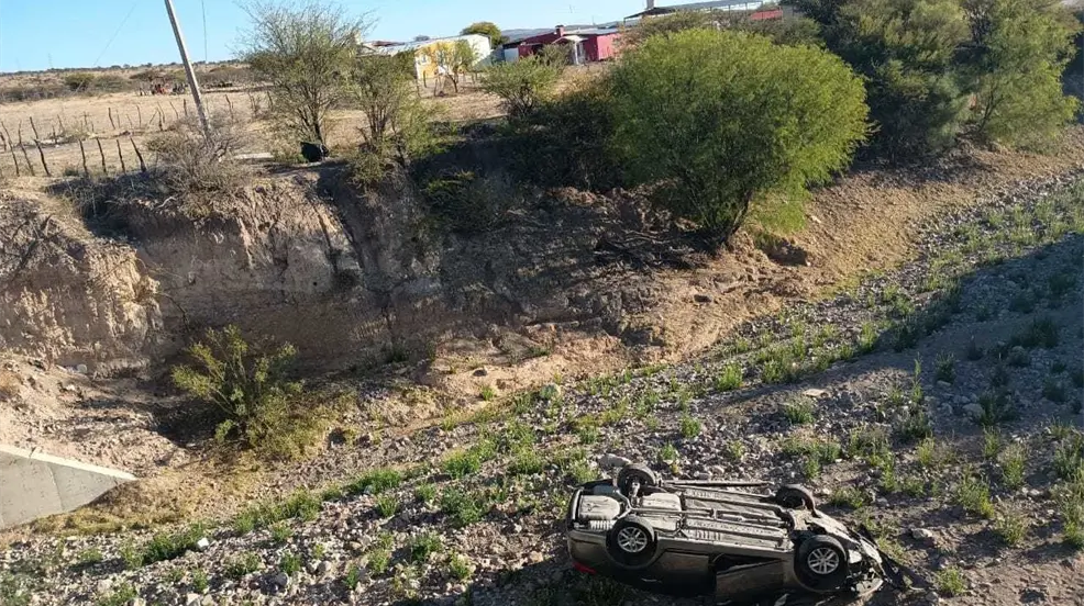 En un descuido, el señor René perdió el control y se salieron del camino justo a un costado de un puente vehícular; el coche acabó volcado, pero su carrocería los protegió a todos.