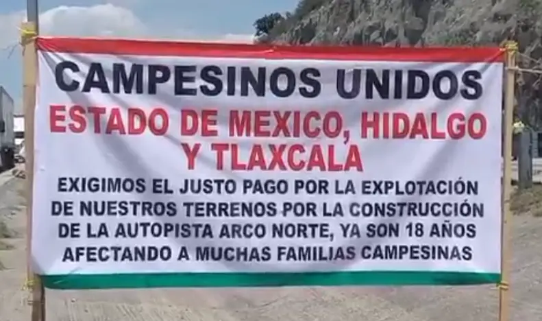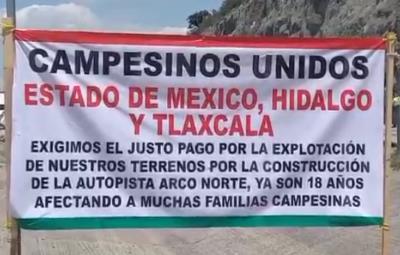 ESTADO DE MÉXICO.- Un grupo de ejidatarios provenientes del Estado de México, Hidalgo y Tlaxcala mantienen bloqueada la autopista Arco Norte desde hace más de 20 horas, exigiendo al gobierno federal el cumplimiento del pago de indemnización por utilizar sus tierras para la construcción de la misma.