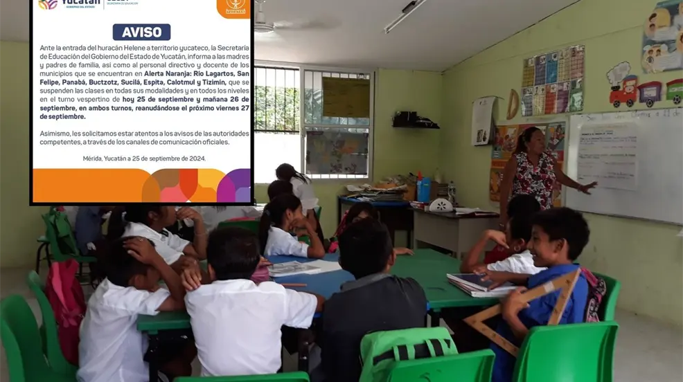 MÉRIDA, Yucatán.- Como medida de precaución por la entrada del huracán “Helene” a territorio yucateco, la Secretaría de Educación del Gobierno del Estado de Yucatán informo sobre la suspensión de clases en todas sus modalidades para este 25 y 26 de septiembre en los municipios que se encuentran en Alerta Naranja.