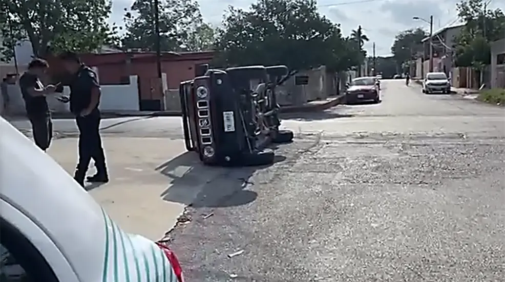 Otro incidente vehicular, pero esta vez en la colonia Bojórquez de Mérida, terminó con una camioneta de caja cerrada resultó volcada tras ser impactada por un auto Versa. El accidente ocurrió en la intersección de la calle 59-D y la calle 114, donde el conductor de la camioneta no respetó la señal de alto y fue golpeado por el Versa, que transitaba hacia el sur.