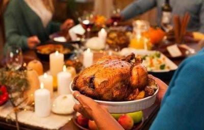 - Cena familiar con pavo, puré de papas y pastel de calabaza.