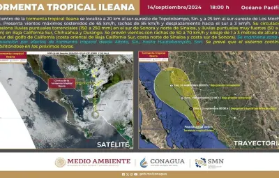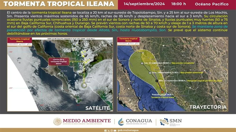 SINALOA.- La tormenta tropical Ileana llegó a tierra firme en Ahome, Sinaloa, durante la tarde de este sábado, tras su paso por el Golfo de California. El Servicio Meteorológico Nacional (SMN) ha emitido un pronóstico de lluvias torrenciales y vientos intensos para varias regiones del noroeste de México, aunque se espera que el ciclón pierda fuerza a lo largo del día.