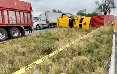 ACOLMAN, Estado de México.- Un tráiler que transportaba un contenedor quedó volcado en la autopista México-Pirámides en la zona de la incorporación a Acolman, fue por una mala maniobra de un camión de carga que el tráiler fue golpeado en la parte de la cabina que perdió el control y quedó volcado, además un vehículo particular se vio involucrado.
