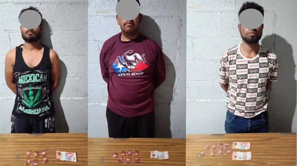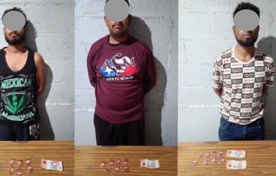 Una vez que fueron revisados, los tres hombres tenían entres sus pertenencias dinero en efectivo y envoltorios con vivos en color rojo que en su interior contenían polvo blanco semi granulado con las características del cristal.