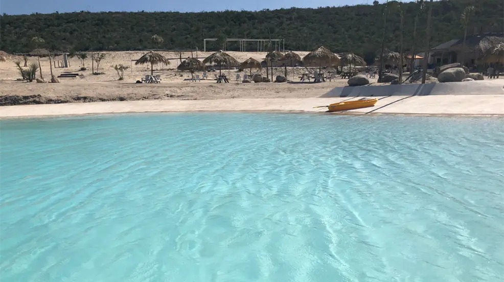 Playa Bonita es una playa artificial que desafía las altas temperaturas y el clima árido de la región. Este singular destino cuenta con albercas, palapas, restaurantes, un hotel, y amplias instalaciones deportivas como canchas de fútbol y voleibol playero, todo esto en un entorno de 25,000 metros de arena.